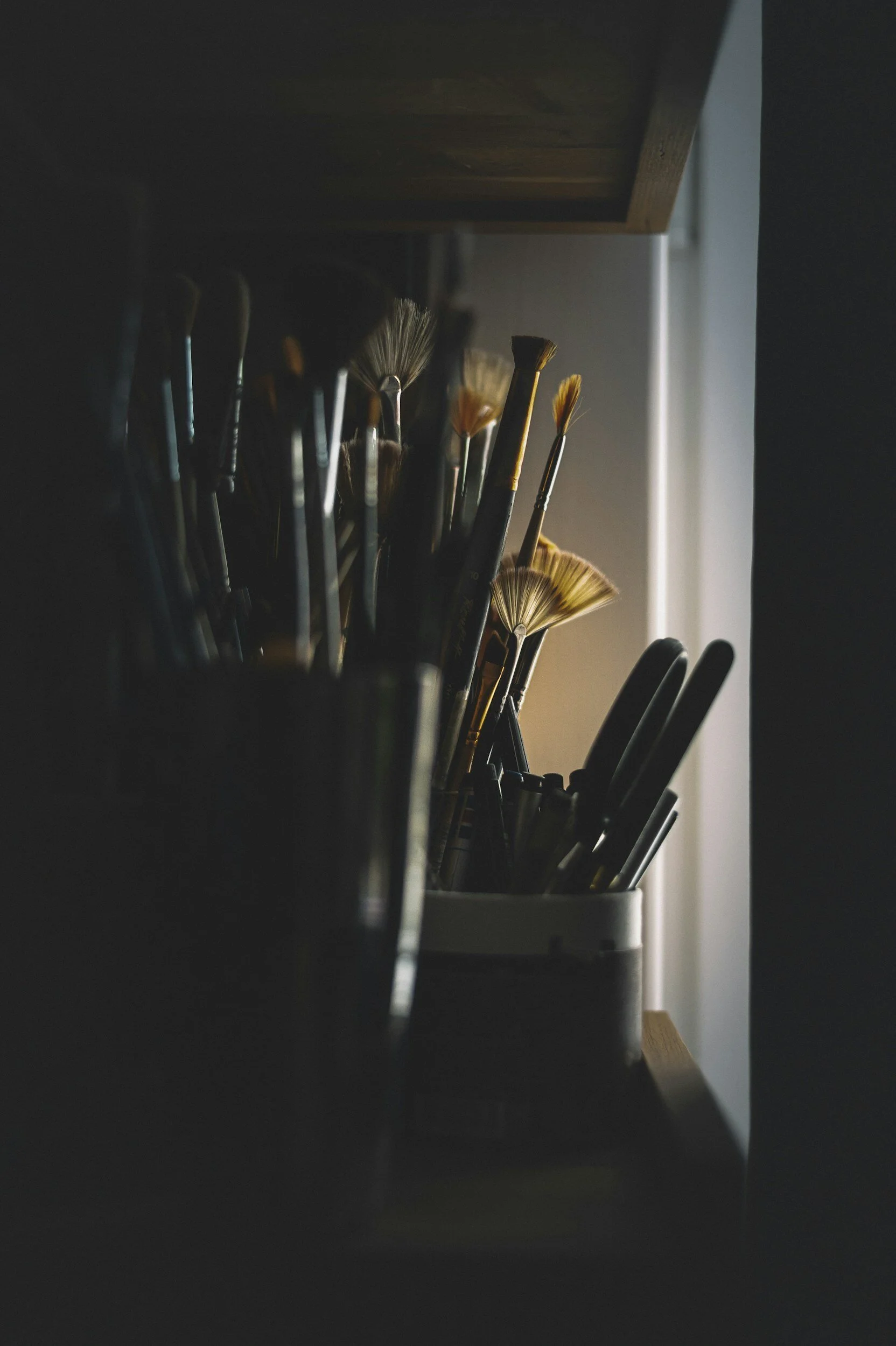 A collection of paintbrushes stored in a container near a window, with natural light illuminating the brushes.